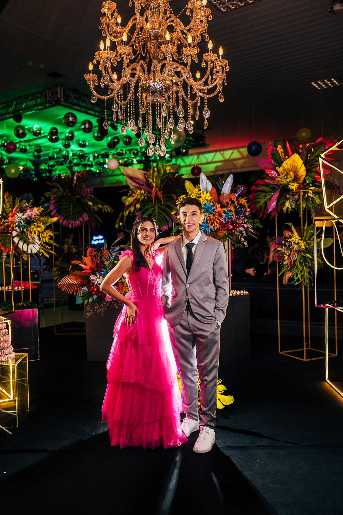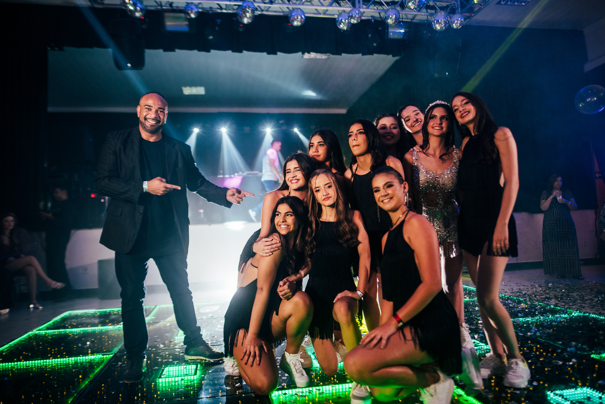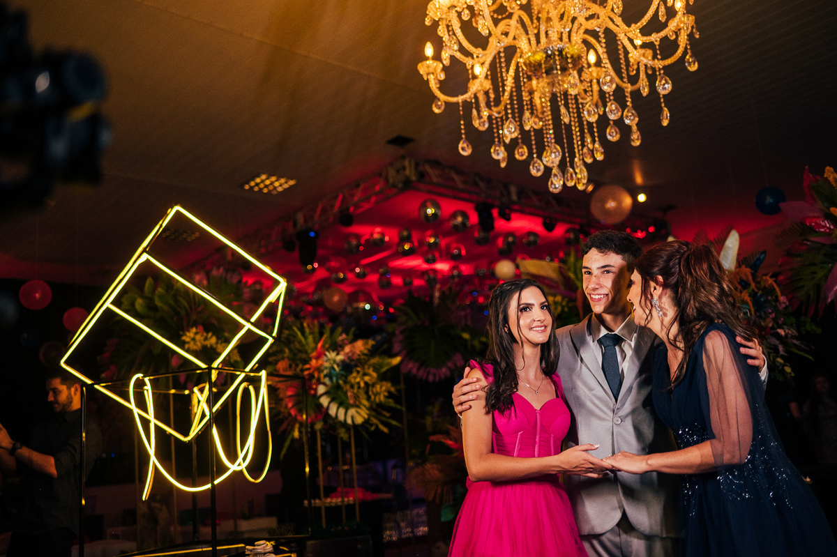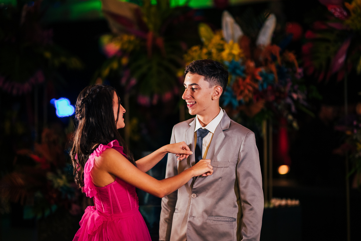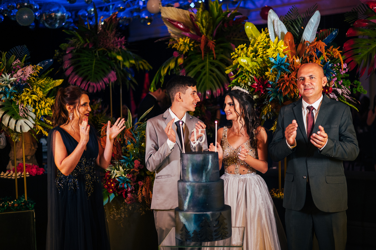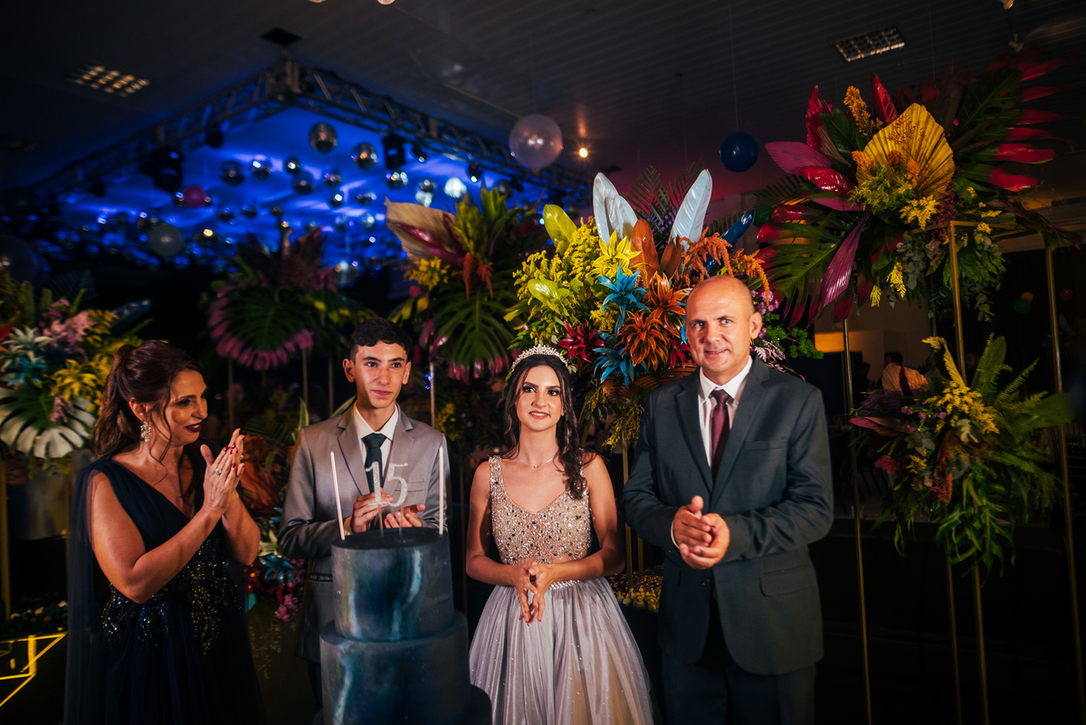Essa história começa bem antes, a Elaine mãe dos gêmeos correndo contra o tempo pra fazer uma festa para as crianças, a preocupação dela era criar algo que fosse importante para os dois, pensamos no ensaio, na decoração, tudo para mostrar essa dualidade, a única coisa que o Vinícius não quis participar foi da dança com a as meninas, mas Laura fez isso com excelência.